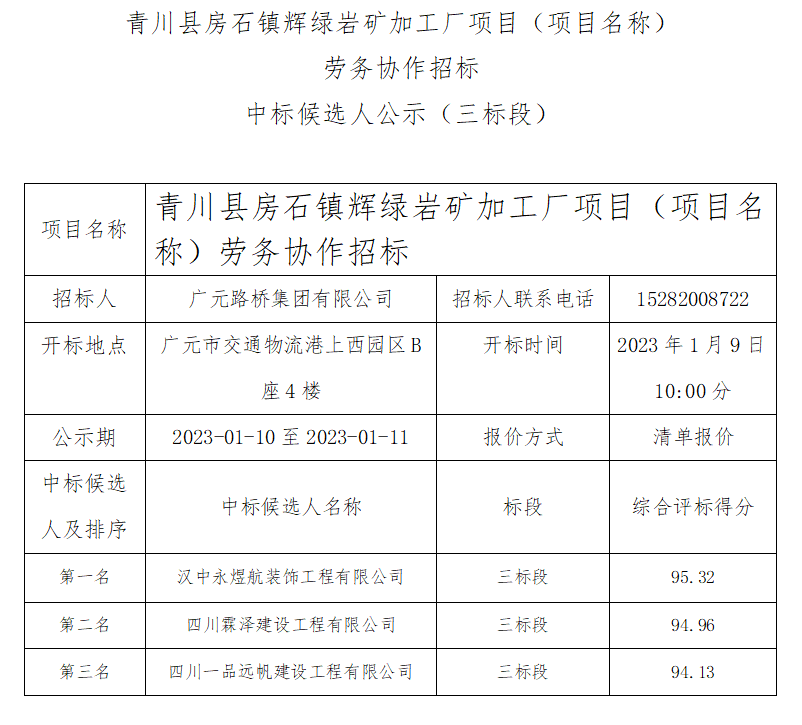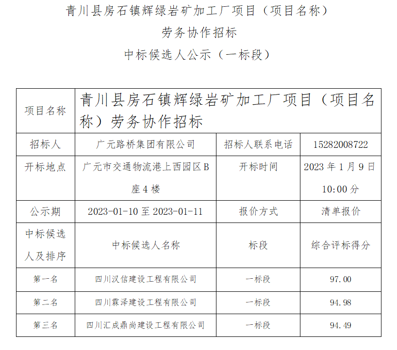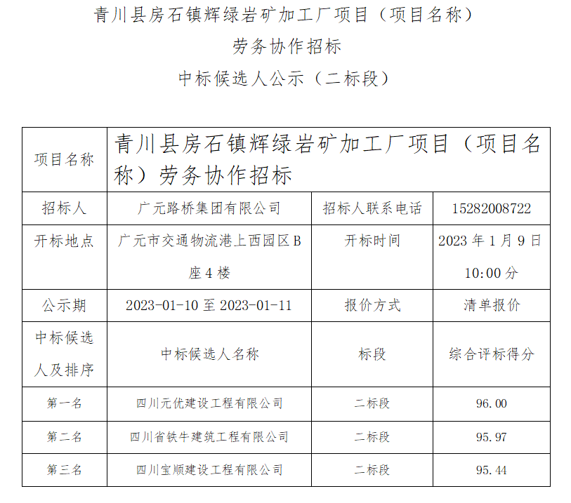 青川縣房石鎮(zhèn)輝綠巖礦加工廠(chǎng)項(xiàng)目(項(xiàng)目名稱(chēng)) 勞務(wù)協(xié)作招標(biāo)中標(biāo)候選人公示